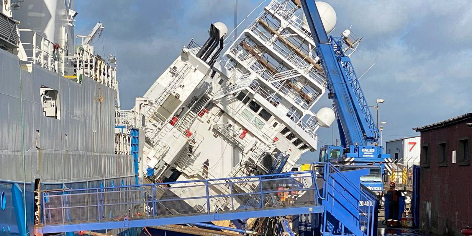 Twenty-five people have been injured after a research ship tipped over in a Scottish dry dock on Wednesday.